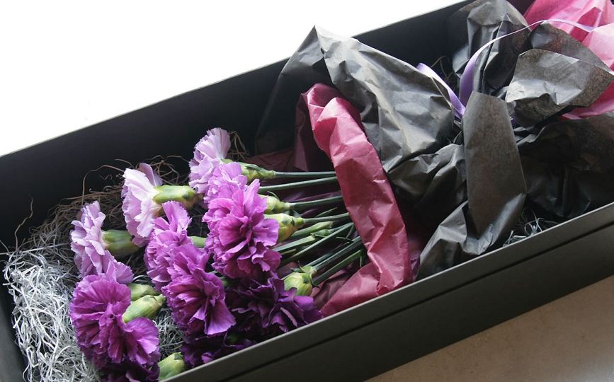 ※ 当店の「カーネーション・ムーンダスト」を使用した商品は、ムーンダスト特有の高貴なムラサキ系を色合いを生かしつつもナチュラルテイストにアレンジメントした商品となります。