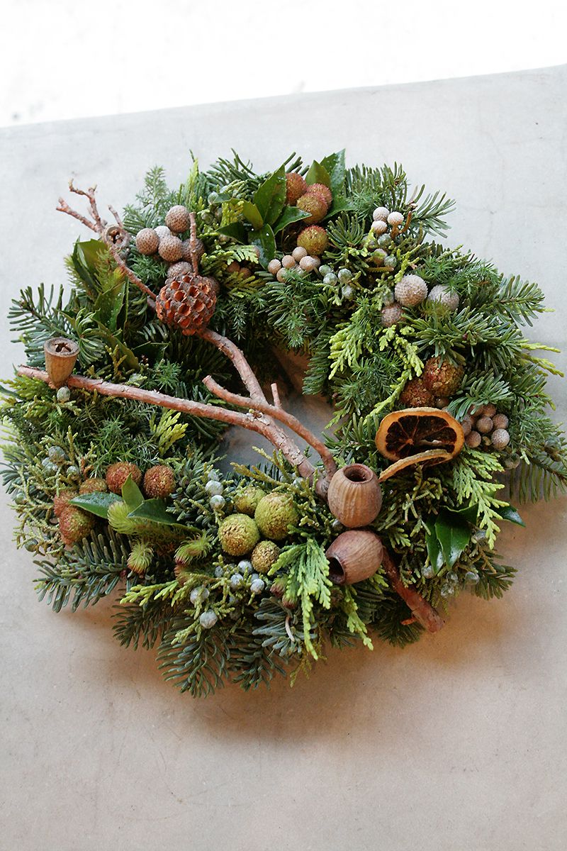 アメリカのオレゴン州に住むマダムから教えを請うた伝統的(古典的)な手法により、多くの生の木々や木の実を細かく編み込んで作る本物のクリスマスリース。リースの土台にはワイヤーやグルー・ボンドは一切使用していないのが特徴。